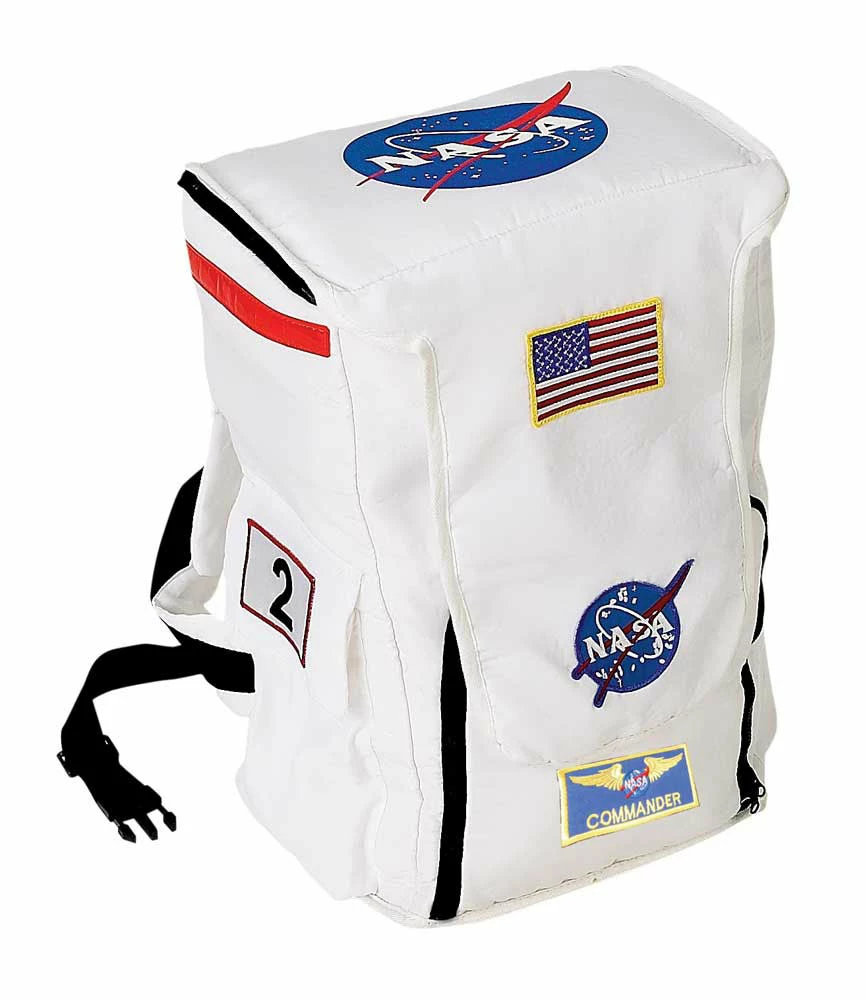 This back pack holds all of your space gear. Top compartment is for your Astronaut Suit or boots, and the bottom compartment stores your Astronaut helmet. Also has a side pocket for tools, etc, and three-way harness system for comfort and realistic look and feel. Child size. Approximate dimensions of backpack are 17.5 x 7.5 x 8.5 inches.