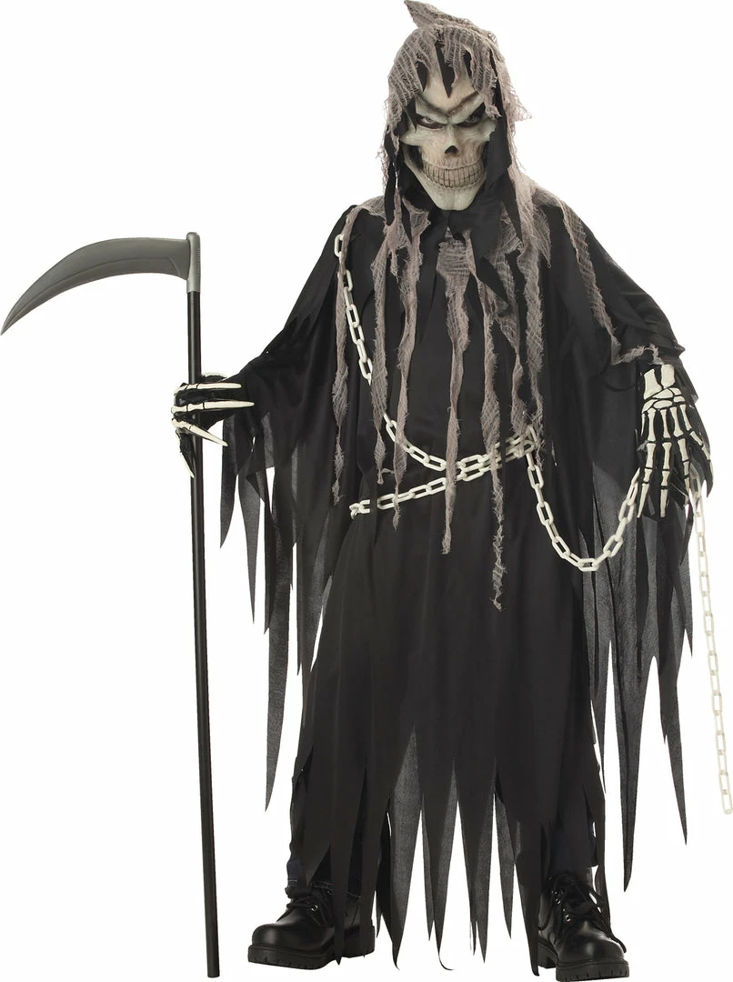 Now your child can scare the yell out of all of his friends with this costume! Black robe, matching hood, glow-in-the-dark mask, hands and chain.