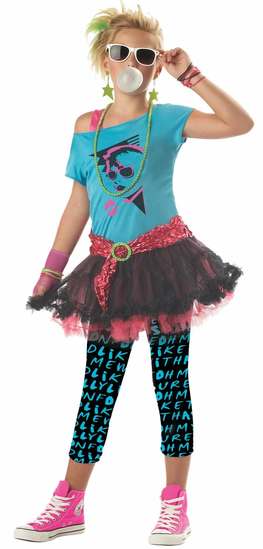 Teach your child about the ’80’s with this retro costume! Blue top with attached pettiskirt, printed leggings, one fishnet glove, scrunchy belt.