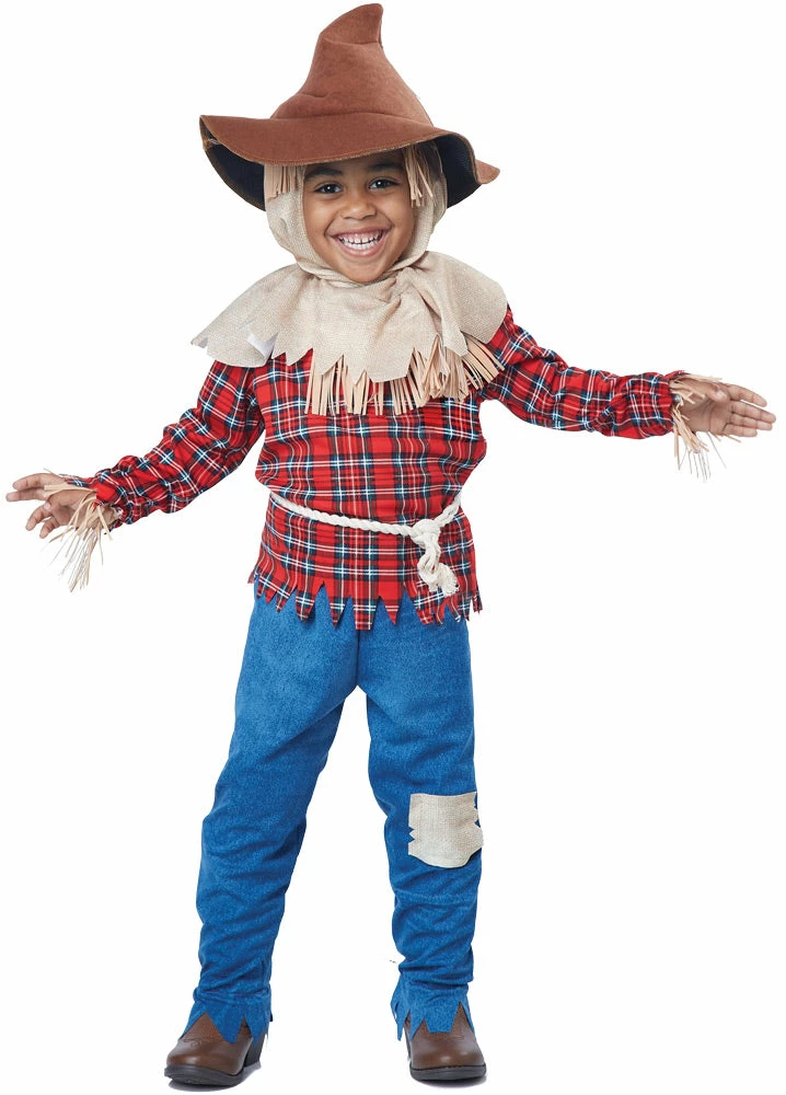 The Harvest Time Scarecrow toddler costume includes shirt and hooded collar with attached fabric, incheshay inches fri with a decorative knee patch and hat with attached fringe. The decorative belt is tacked to the shirt. Add your own shoes.