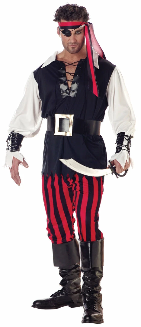 Perfect for pirating on the high seas or anywhere a scurvy pirate is needed. Shirt, pants, head tie, boot tops, belt, and wrist cuffs. Sword not included.