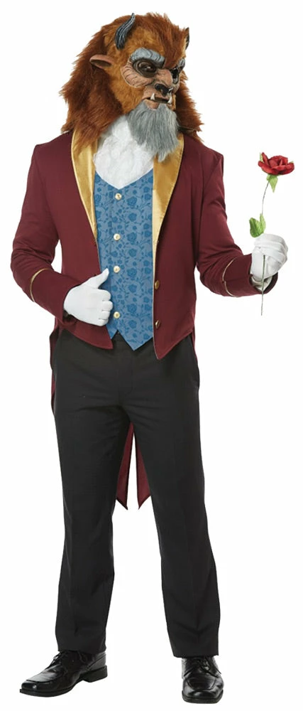 You can be the most elegant storybook Beast ever! Deep maroon tail coat comes with a blue patterned vest, a white cravat, and a two-piece Beast mask with faux-fur accents. Mask has a moveable jaw! Add your own black pants and rose. Spot clean only. 100% polyester.