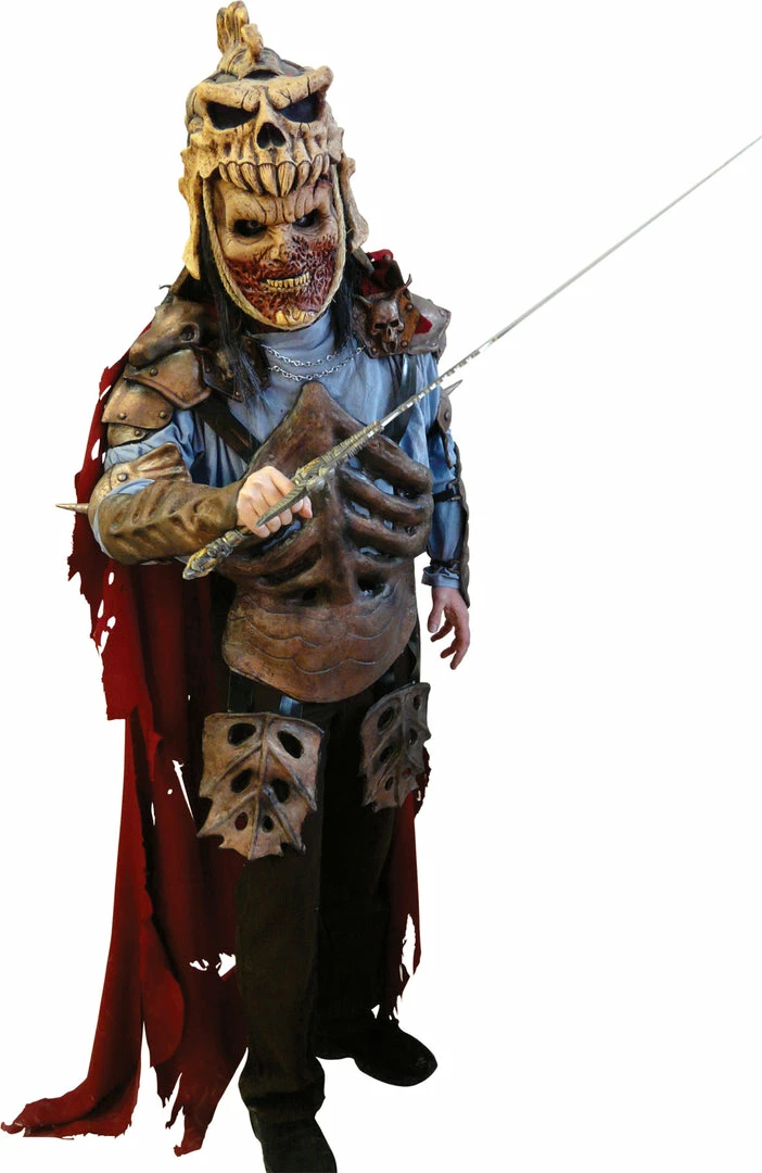 A suit of armor fit for a ZOMBIE KING! This Movie Replica of the costume worn in the movie ARMY OF DARKNESS comes with shoulder pads chest plate leg guards elbow armor and forearm armor. Also includes red cape with Emblem armor and chain as well as Ash double breasted shirt. One size fits most. Pants not included. Mask not included.