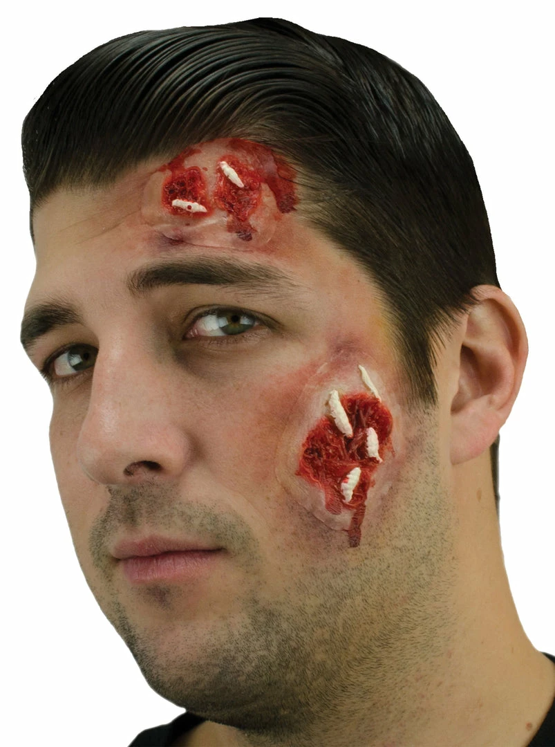 Forward facing blister card containing Woochie peel and stick latex scrapes with maggots appliances, photorealist tattoos and blood.