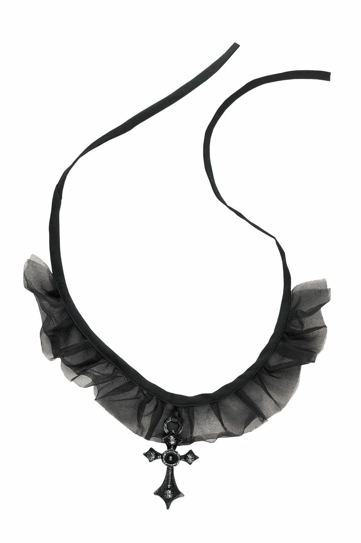 Ribbon tie with gathered chiffon trim and attached cross pendant.
