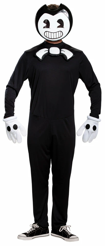 Now you can be the devilish demon from the thrilling video game, Bendy and the Ink Machine. You’re sure to cause a scare this Halloween when you transform into your favorite video game character. Become the mascot of Joey Drew Studios! The Bendy Classic Adult costume includes black jumpsuit, vacuform character half mask and pair of gloves. Shoes not included. Fits most teens.Â