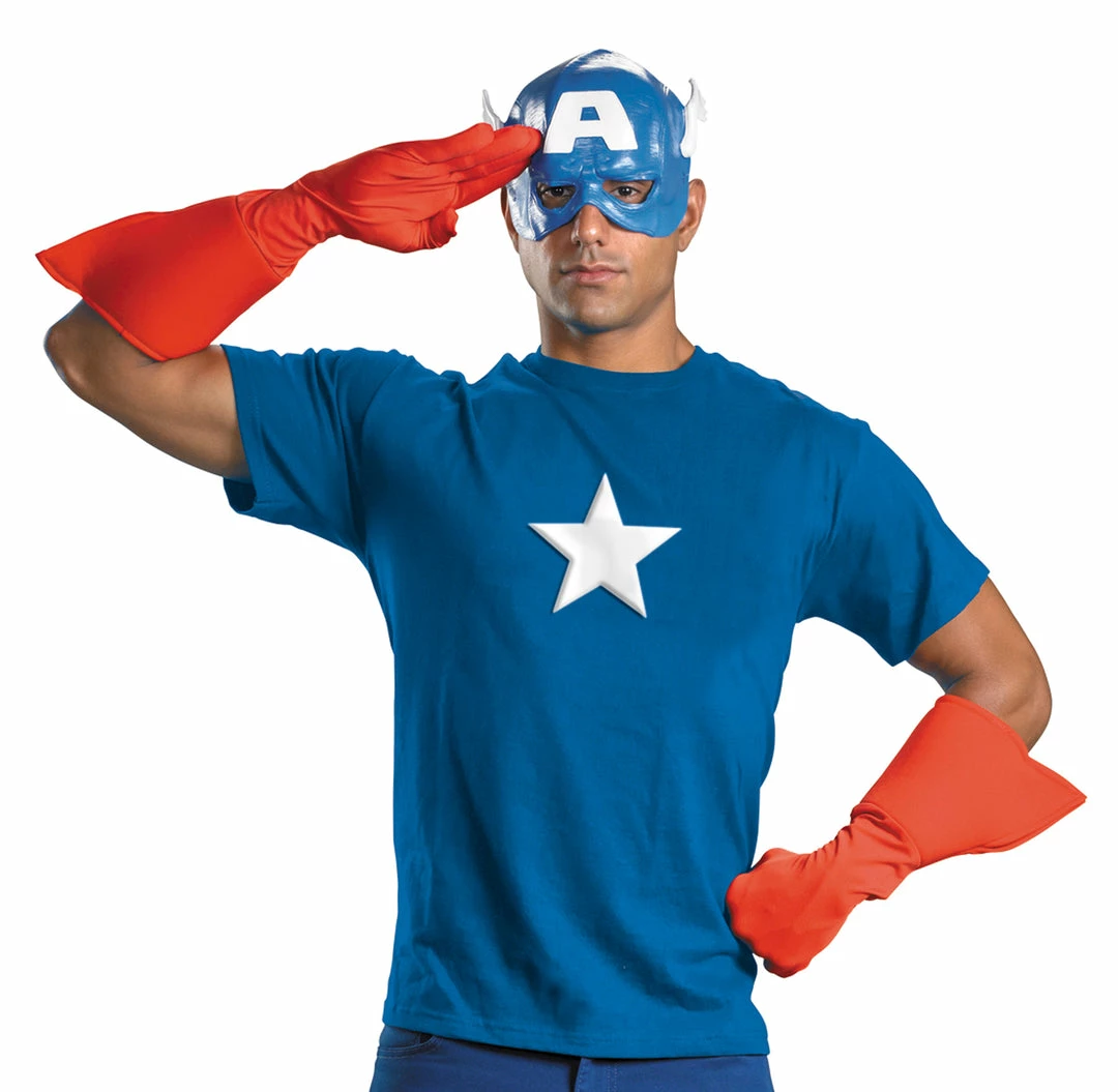 Character half mask, stick on chest emblem and pair of gloves. Supply your own shirt and pants! Adult sized.