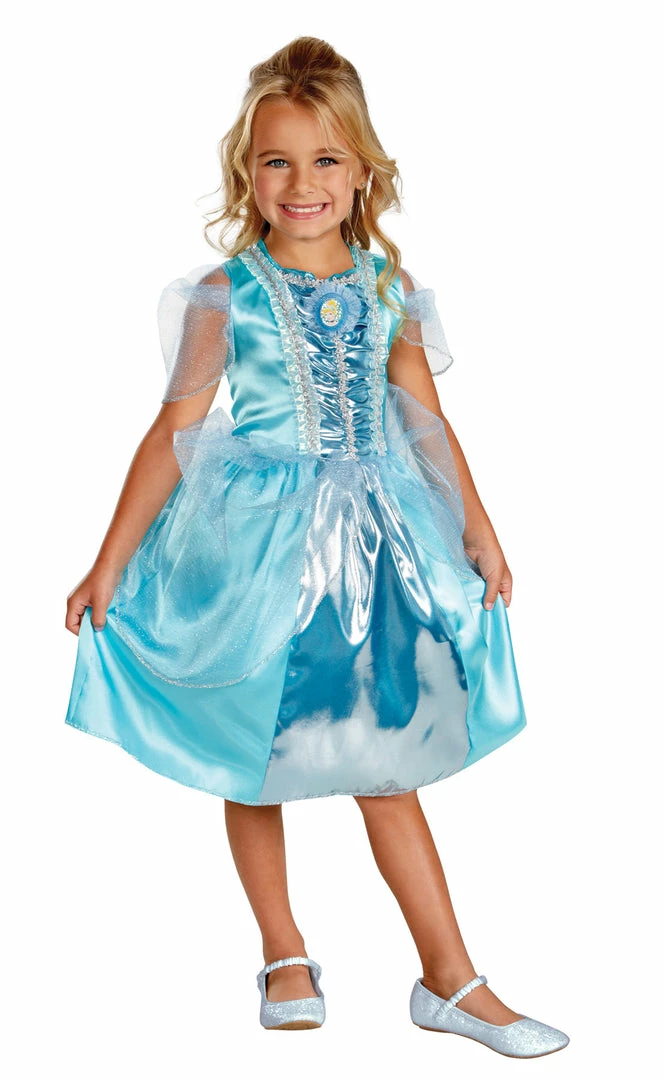 Offivcally licensed. A beautiful blue princess gown fit for Cinderella herself! Satin dress with sheer sleeves and overlay and character cameo. Patterned just like the costume in the classic Disney movie.