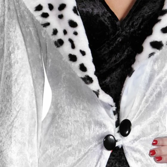 Officially licensed 101 Dalmatians Deluxe Cruella de Vil costume has soft velvety dress, deluxe coat with plush cuffs and collar. Wig, choker, shoes, and stockings not included.