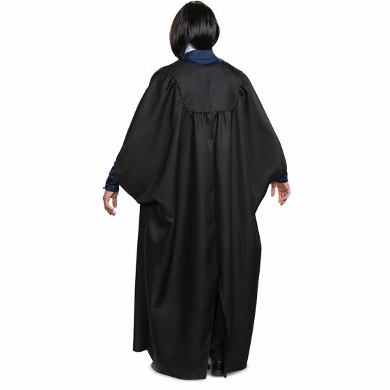 Now you can look just like the dark wizard from Hogwarts School of Witchcraft and Wizardry. Slip into this dark blue tunic and billowing robe to become the Head of the Slytherin House as Professor Snape. This Deluxe Severus Snape costume will have you transform you into the skillful and powerful wizard from the Harry Potter Series. The Harry Potter Men’s Severus Snape Deluxe Adult Costume features a long flowing black robe, dark blue jacket with decorative buttons and white cravat collar. The black robe has slits in the arms and drapes to the ground. Professor Severus Snape Wand, black wig, pants and shoes not included.