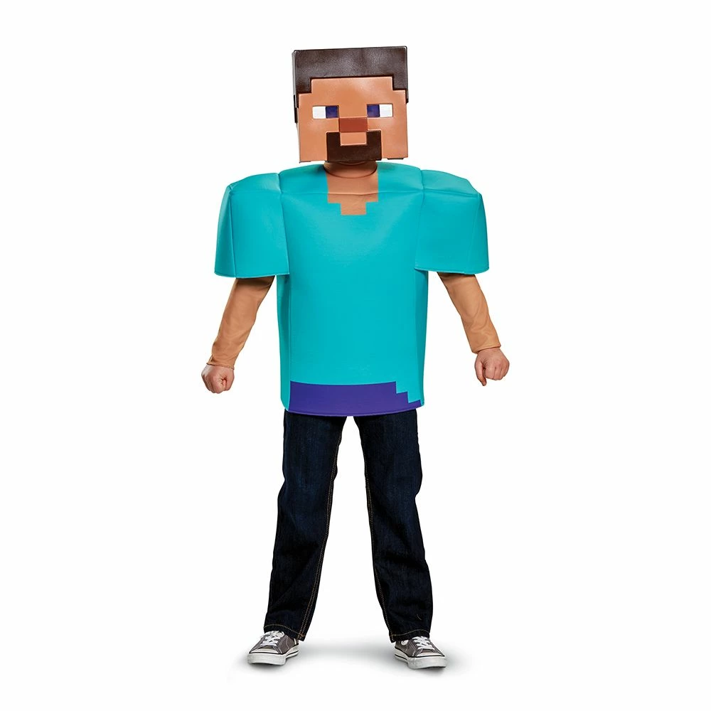 Embark on a real life adventure with this child’s Minecraft Steve costume! The tunic is designed to mimic the game’s 3-D blocky visual style and has ample range of motion. The kids long-sleeve tunic features detailed character print on the front and back. The character correct Vacuform half mask includes a mesh eye-plate and foam insert designed to be more comfortable for wearers and allow for an outstanding range of vision. This is an officially licensed Minecraft product. Ideal for Boys and Girls