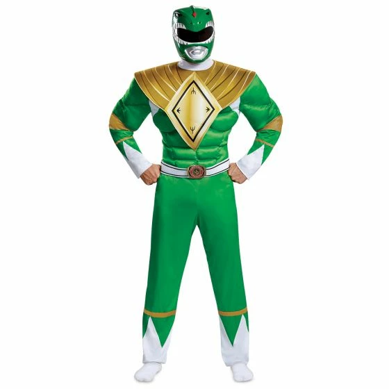 From the hit television show, Mighty Morphin Power Rangers, this Green Ranger Suit and Mask will transform you into your favorite hero. Unite with your other Mighty Morphin Power Ranger friends to take on the evil forces such as Lord Zedd, Rita Repulsa, and Master Vile. The Power Rangers Green Ranger Classic Muscle Adult Costume features a green jumpsuit with white diamond print pattern, muscle torso, muscle arms, attached belt, belt buckle and helmet with black visor. Socks not included.