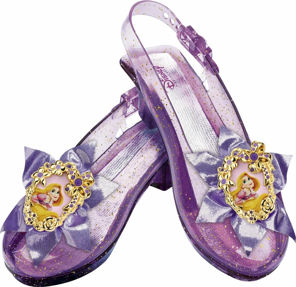 Features: Adjustable Strap, Purple sparkle slingback style shoes have a small heel and Rapunzel cameo, Officially licensed, the perfect finishing touch to your Disney Tangled Costume
