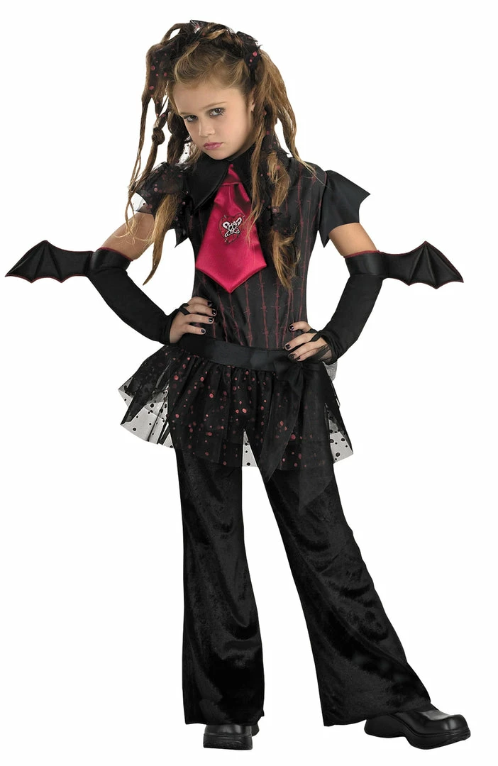 This gothic style vampiress costume features a black jumpsuit, overskirt, collar with attached red tie and black glovettes with bat wing accents. Hair ties and shoes not included. 100% polyester.