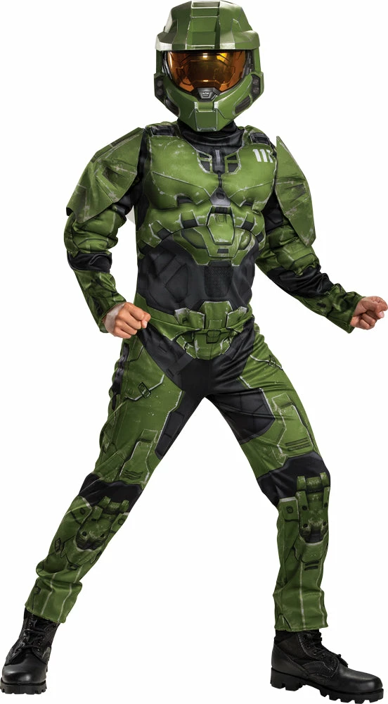 Now you can dress up as your favorite video game character from Halo Infinite with this Master Chief Infinite Muscle suit. Save humanity when you become the greatest Spartan soldier of all time. The Halo Master Chief Infinite Muscle Child costume by Disguise features a green and black jumpsuit with muscle torso and arms. Also includes character half mask. Boots not included.