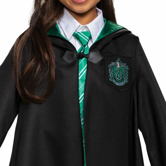 Swish your black robe and make a dramatic entrance this Halloween dressed in this Prestige Harry Potter Slytherin Robe. Grab your wand and let the magic begin when you wander the halls of Hogwarts School of Witchcraft and Wizardry. Represent your Hogwarts House and carry on Salazar Slytherin?s legacy dressed in this high quality Harry Potter Slytherin The Harry Potter Child?s Prestige Slytherin Robe features a black robe with Slytherin crest and green satin lined hood, sleeves and lapels. Pants, white shirt, tie, wand and shoes not included.