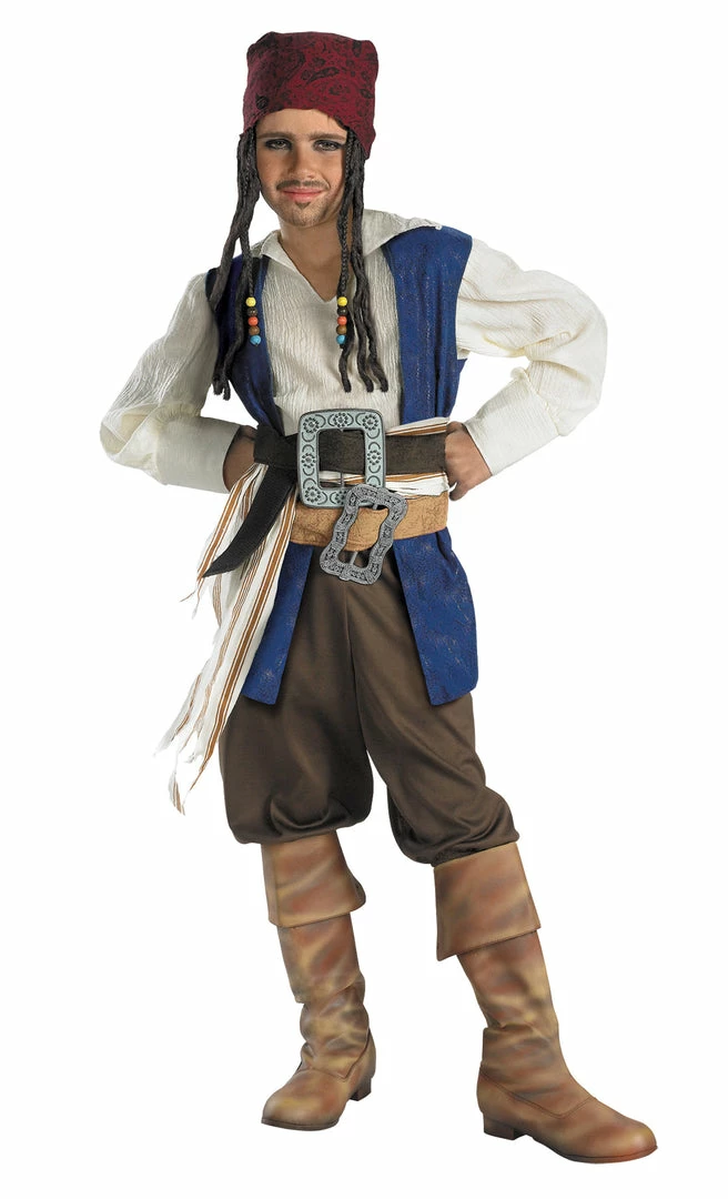 Your child’s favorite captain now comes in this great costume! Costume includes a shirt with attached blue vest, fabric sash, two belts with attached buckles, brown elastic waist pants and a bandana with attached braided hair. Add boots and make-up to complete the look. 100% Polyester. Care instructions: Hand wash cold separately, line dry. Do not bleach or dry clean. Cool iron if necessary.
