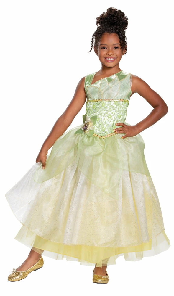 One piece dress with shoulder straps starts out greenish at the top but ends up yellow by the tip of the ankle-length hem. Comes with bow on the waist with character cameo in center. Shoes not included.