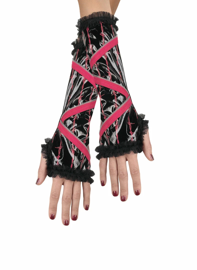 Fingerless gloves with zipper-look design and trimmed with, nylon netting edging. Polyester. One size fits most adults.