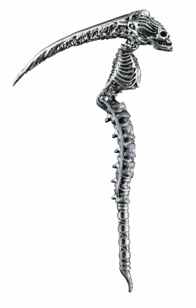 Wicked looking silver-colored scythe with skeleton details. Length is 18 inches.