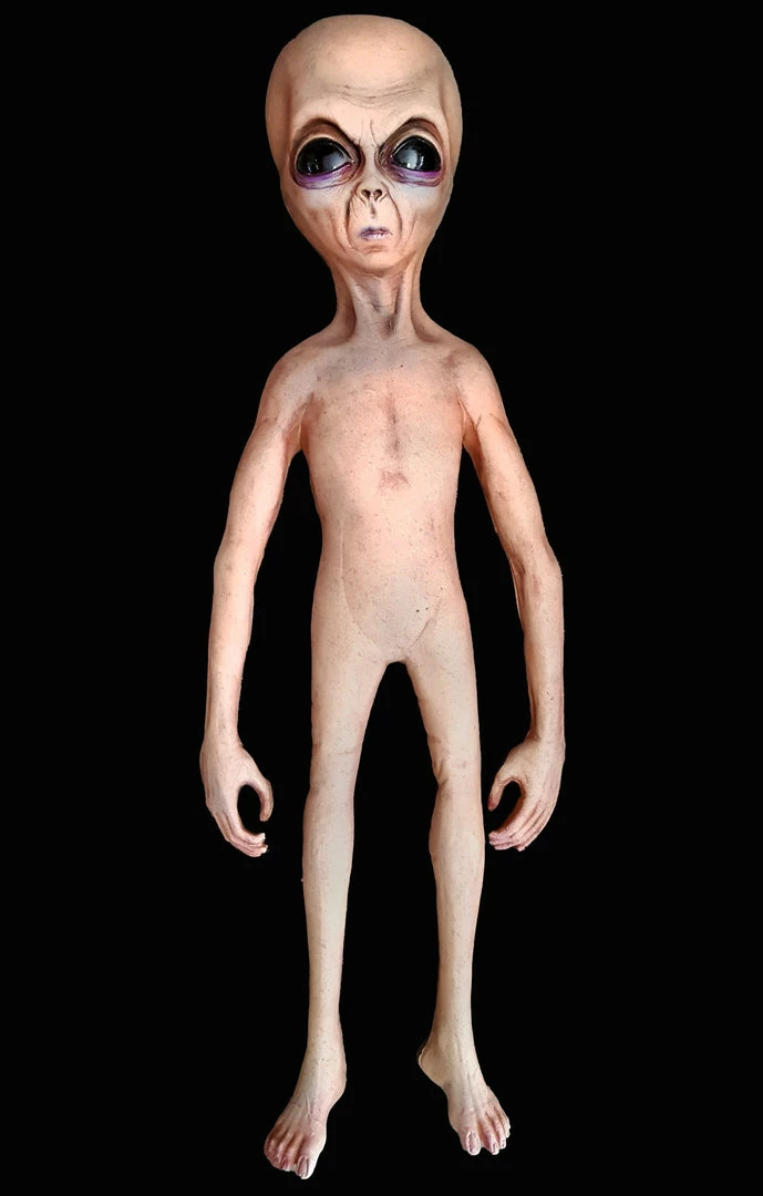Our high quality life-sized Alien Prop is 4 1/2 feet tall and is hand painted with a realistic look. These alien props are made of latex and foam filled to allow them to be repositioned to pose in various scenes. Create a creepy sci-fi scene or use our alien as a Halloween prop to decorate your home, yard, or for a party. Although these aliens are out of this world many people enjoy posing with them in photos here on Earth and love creating funny scenes at home, in businesses, parties, in the car, at the beach and even dress them up!Â