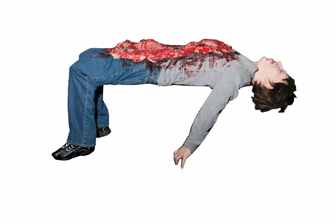 Full length animated body is gutted out. His head is slowly moving and legs are twitching. Designed to be filled with ‘blood’ and has a plastic container foamed into the body. Perfect addition to Bubba. Gruesome! Includes movement control, digital sound and speaker.