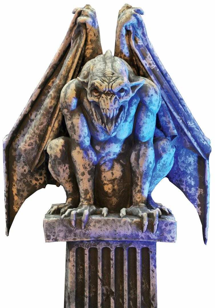 Foam and latex Gargoyle Display with metal armature and embedded fog tube. This Gargoyle is over 7 ft. tall from the bottom of his pillar to the top of his wing tips. Wings can be moved up manually and secured to stay in the up position, or can be displayed with the wings in the down position. Very easy to transport. Great for rentals, displays, parties and haunted attractions.