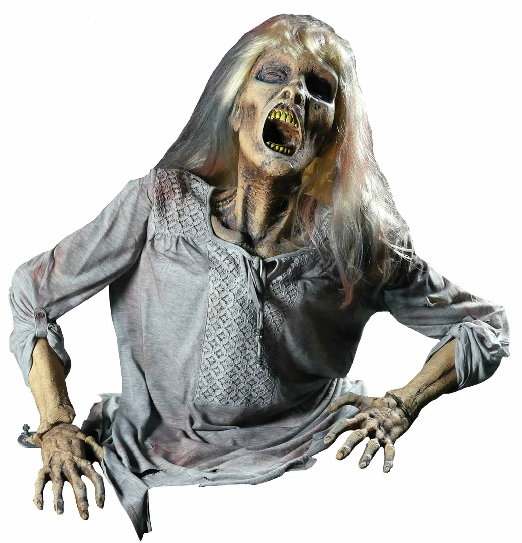Female corpse moves from side to side and screeches, trying to get out of her grave. Detailed with decomposing skin, a distorted screaming mouth with yellow teeth, long wispy hair and boney hands. Great Halloween prop to add to your collection of the strange, unusual and undead!, Foam-filled latex prop with heavy duty metal armature and motor. Includes 5V 5 amp Power Supply and soundtrack CD. Requires AC power. Lifesize upper torso. Costume may vary. Boxed dims: 26x26x12