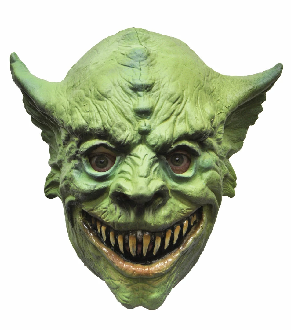 Green demon with yellow fangs for teeth is made of soft, natural latex.