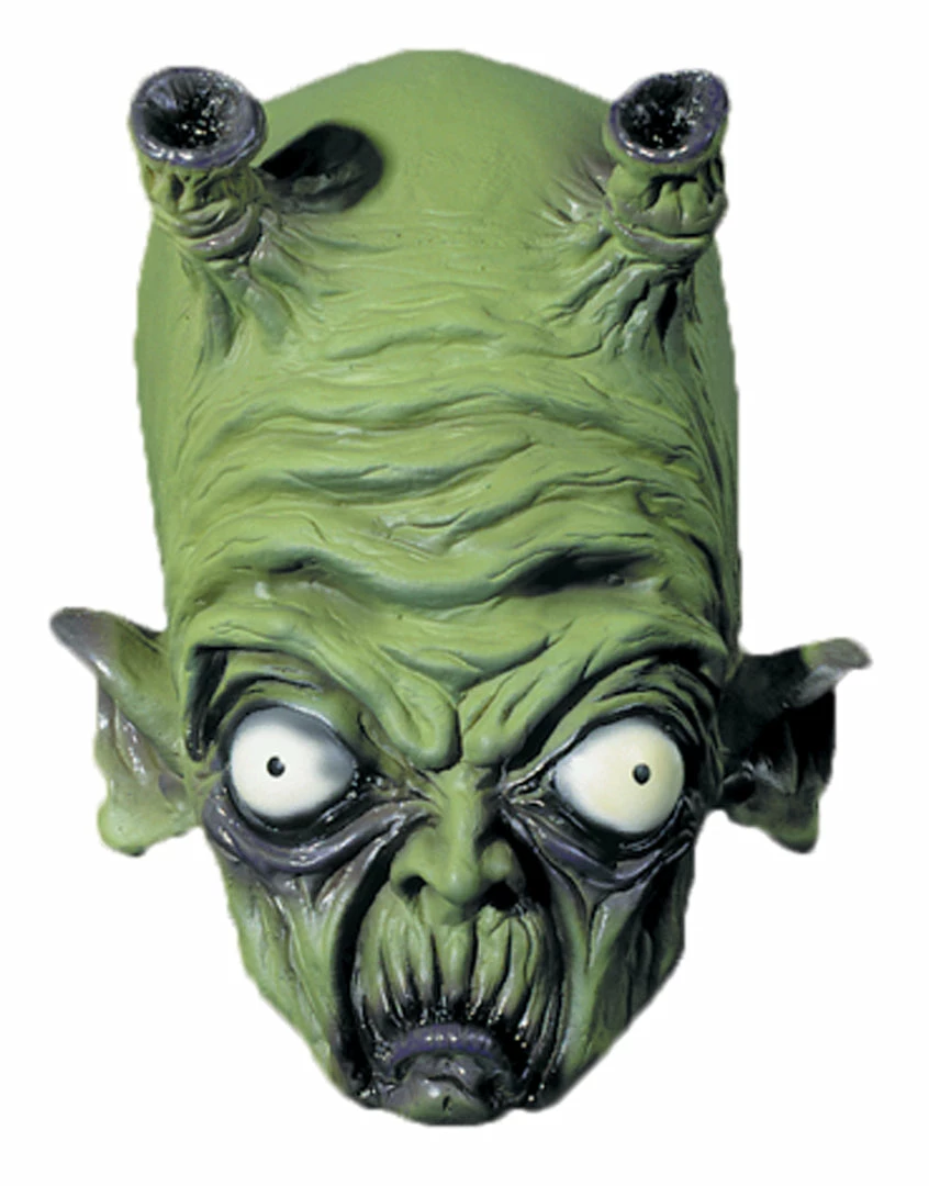 Green alien mask with bulging white eyes is made of Soft, Natural Latex.