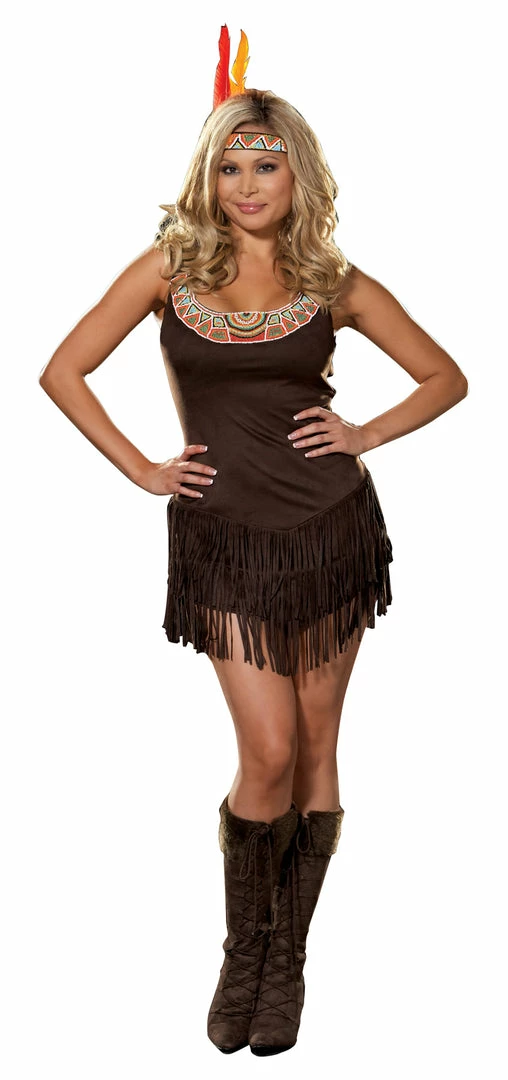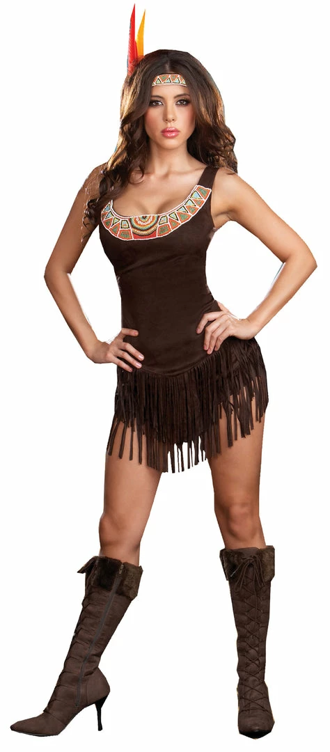 Brown micro Suede stretch dress with intricate Indian beading and layered fringe hem. Includes matching Indian beaded headpiece with feathers.