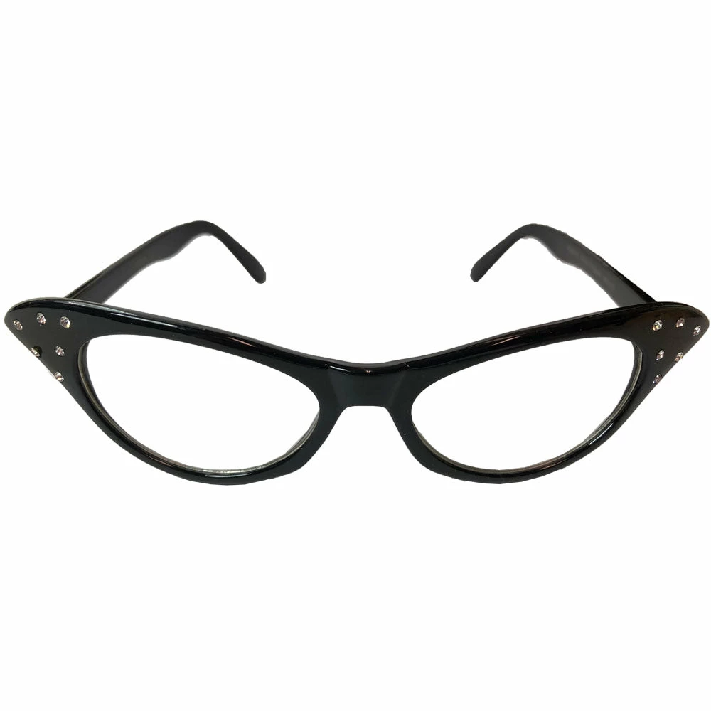 Classic 50’s cat eye shaped black plastic framed glasses with clear lenses has 5 little rhinestone accents in the upper corners. Great for your next Sock Hop, Grease Production, or fun 50’s Party!               Â