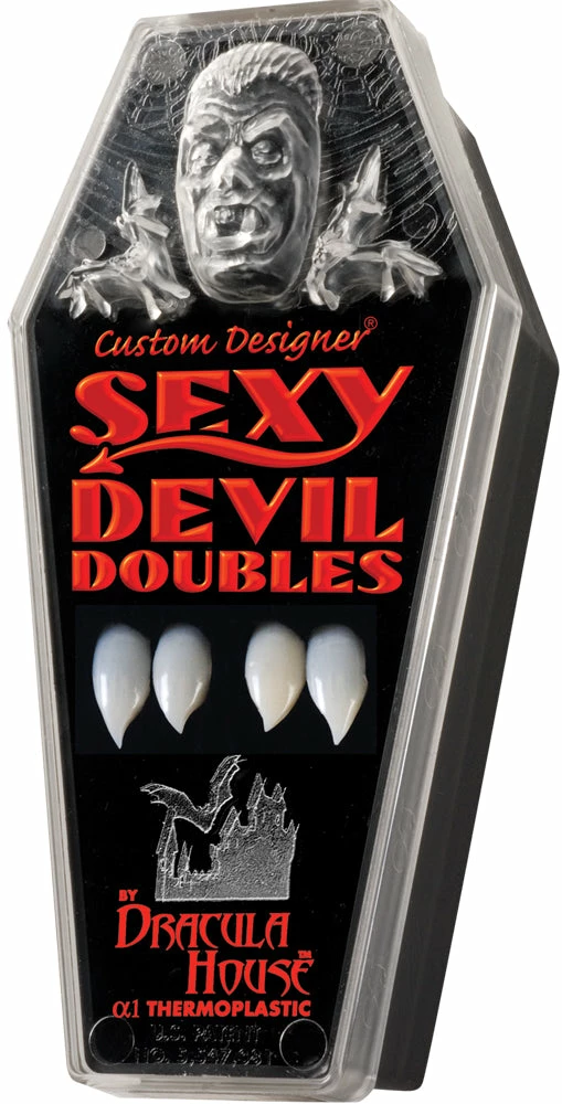 Custom Designer(R) Sexy Devil Fangs(R) are beloved by party-goers and actors worldwide because of their natural look and secure fit that enables them to talk easily and naturally, as well as drink cold beverages! Custom Designer Fangs can be worn many times without refills or adhesives. Each set includes a package of non-toxic Alpha One(TM) Thermoplastic and complete instructions to create a custom fit. The packaging also has a scan-able QR code for access to a demonstration video for perfect fitting techniques. Natural tooth color and superior product quality and finish make these the finest fangs available! Sexy Devil Bites Doubles gives you 4 fangs, 2 for each side. size.