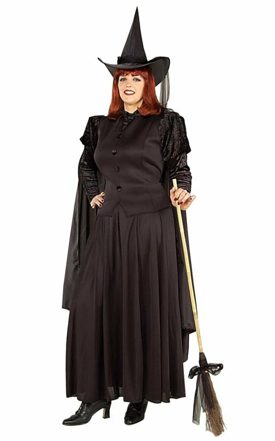One witchy woman! Hat with attached scarf, cape, top and skirt. Broom and shoes are not included. Full figured plus fits sizes 16-22.