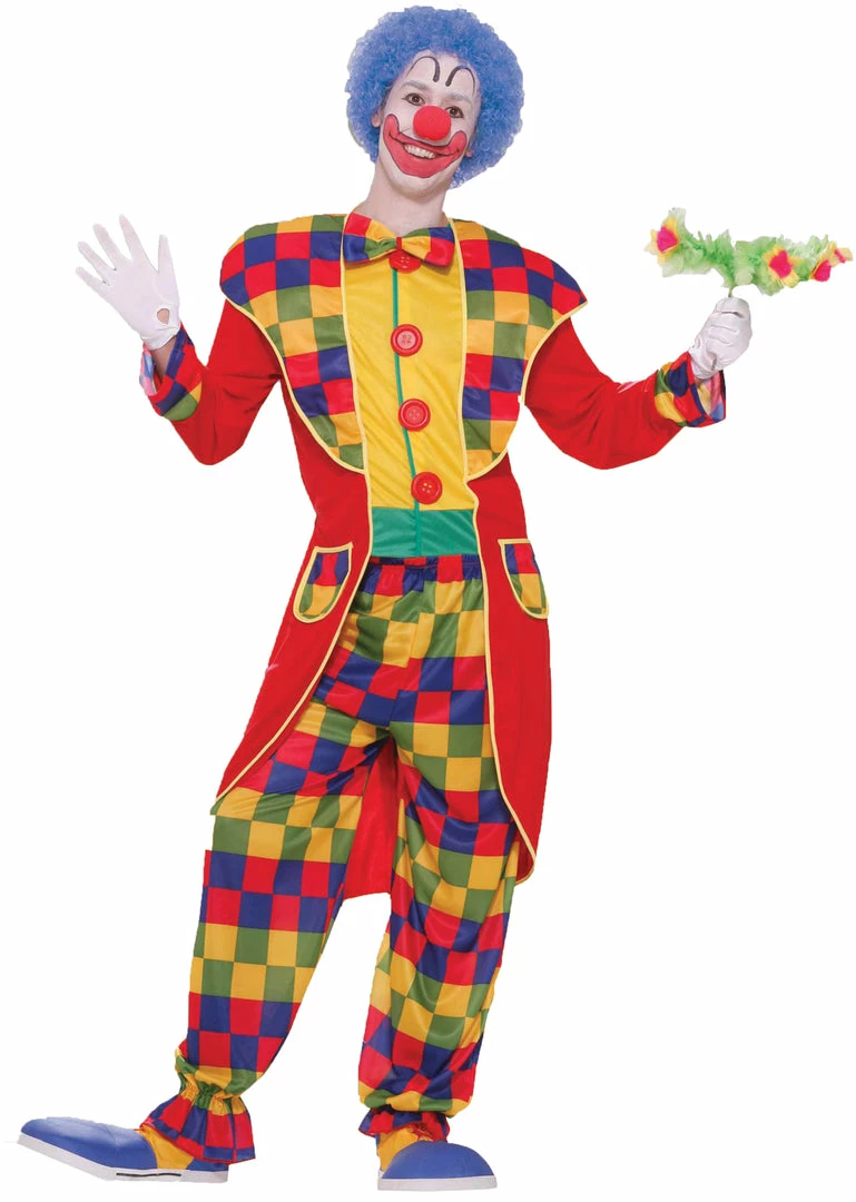 Clowny meets classy with this great costume. Multi-colored pants, jacket with attached shirt front, and bow tie. Gloves, wig, nose, makeup and shoes not included. One size fits most adults.