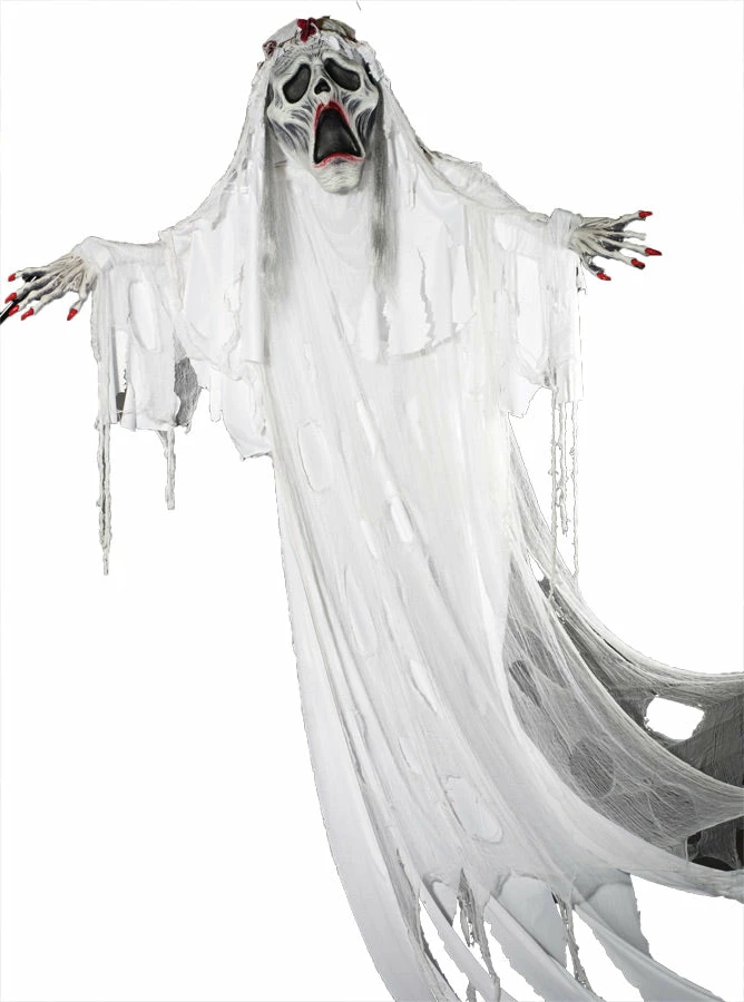 Horrifyingly scary hanging prop of ghost bride. Approximately 12 foot tall prop with enlarged head and hands. Comes with ghostly bridal gown.