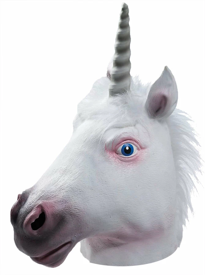 Full over-the-head latex mask of unicorn with pink shading and blue eyes. One size fits most adults.