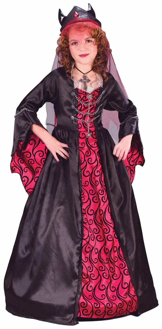 Dress with chain accented bodice, cross necklace and horned headpiece. Polyester, nylon.