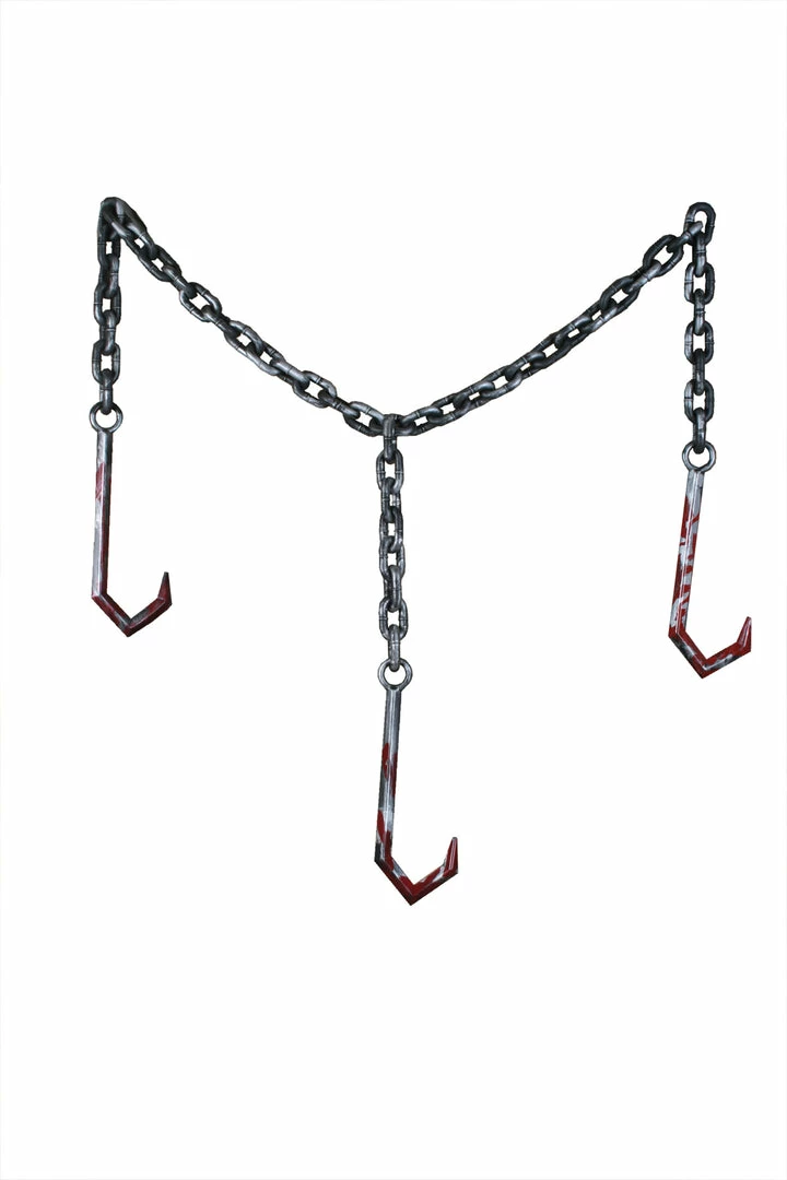 Looks like something straight out of a horror movie. 3 bloody meat hooks connected to old look plastic chain. Great decoration item for any haunted house or home haunter.