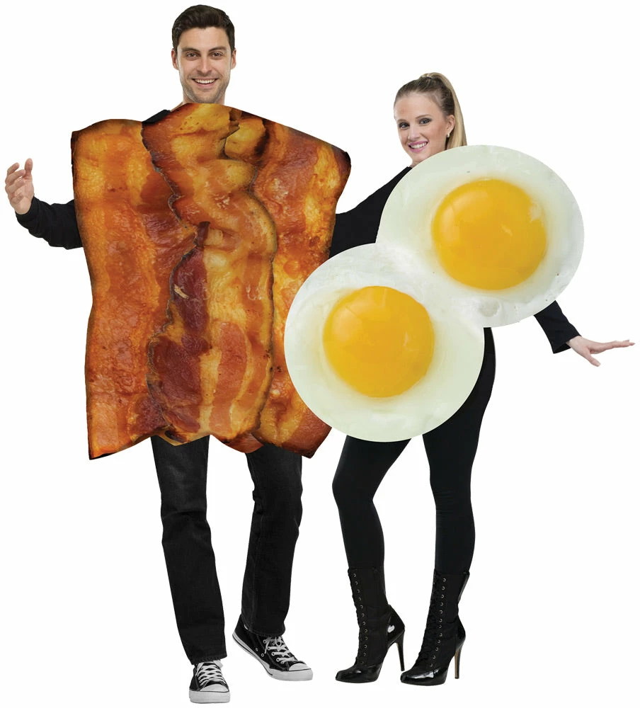 Two Costumes Great couples costumes! Everyone’s favorite breakfast in a great new look! Cloth-covered foam tunic has a photorealistic print of bacon and comes with a matching eggs tunic. Both costumes are in one bag. Just wear your own black shirt and pants! Fits up to 6ft/200lbs and up to size 14.