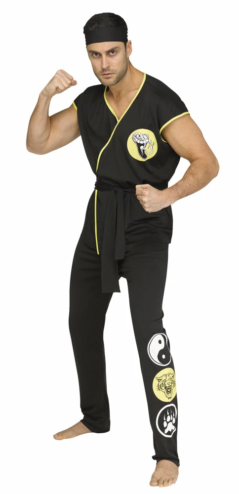 You can look just like a skilled karate fighter thanks to this authentic-looking karate gi-styled costume. Top with insignia on chest, pants with 3 insignias on leg, and black headband. One size fits most up to 6’/200 lbs.