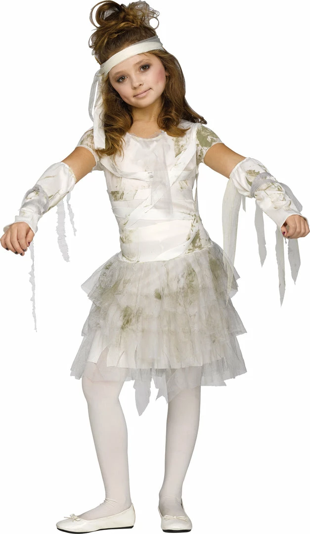 A fun childrens costume that will let your little mummy have a great time at her Halloween event! White tattered-look dress with tiered tattered skirt, white sleevelets with hanging material and headband. Fits childrens sizes 12-14.