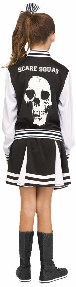 Help your favorite fearleader embrace her love of the macabre with this great new costume! Black school-style jacket with skull design on one side and rib cage design on the other, matching pleated skirt.