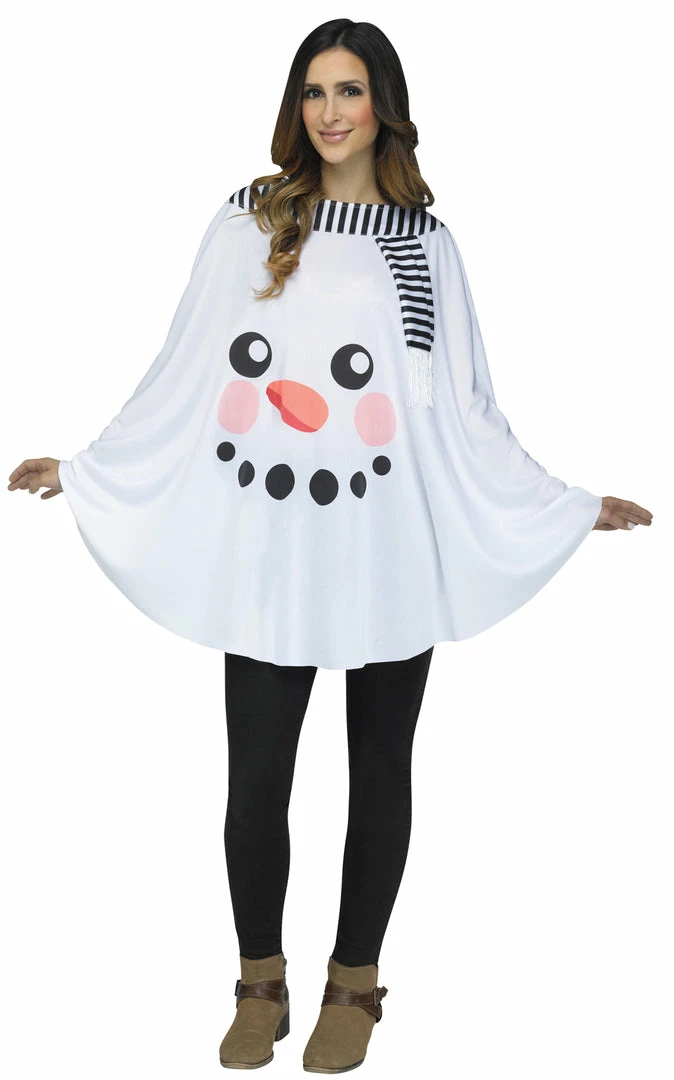 Plush white snowman pullover poncho has a printed snowman face with a striped neckline that looks like a scarf! Just add your own leggings and cool boots for a great look! One size fits sizes 4-14.