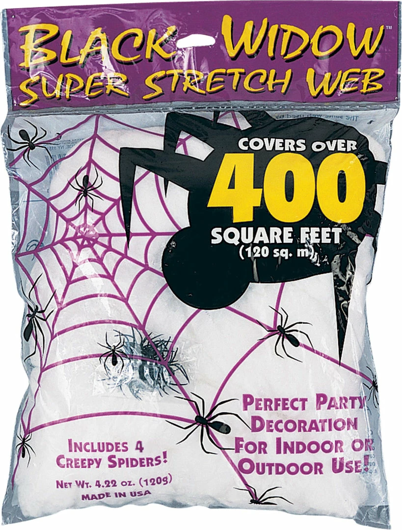 Stretch over a given area for creepy, haunted look. Poly bagged and headered. Stretches to cover 400 square feet. Polyblend.
