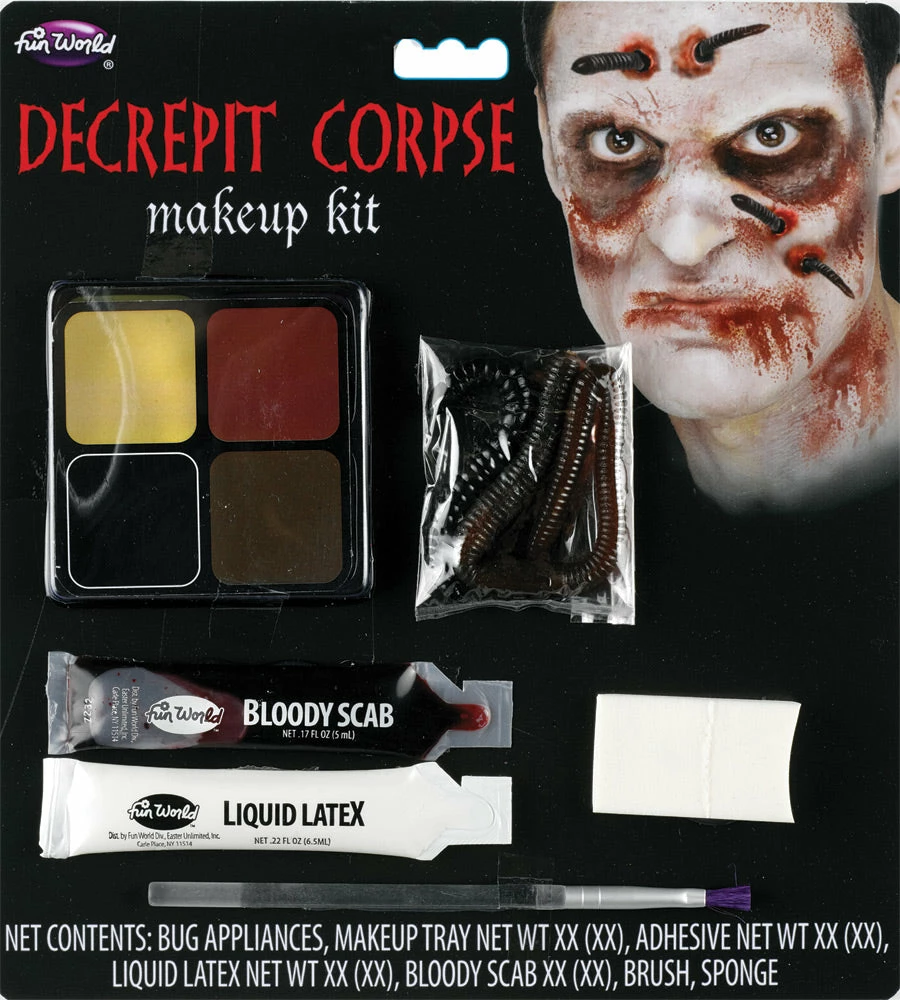The perfect finishing touch to your corpse character! Will make you look as disgusting as any corpse! Contains creepy crawler insect appliances, 4 color makeup tray, liquid latex, bloody scab, brush and sponge.