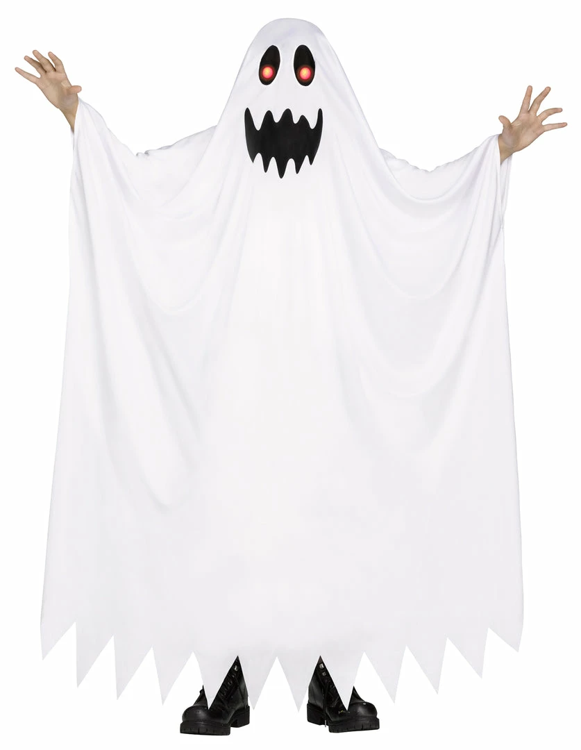 Your child can now scare the yell out of his friends and neighbors with this great ghost costume! White ghost tunic with printed mouth and fade in/out mechanism glasses. Requires 3 AA batteries, not included.