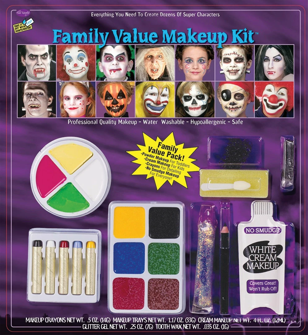 Makeup Kit Includes 6 color makeup tray, 4 color powder tray, glitter gel tube, outline pencil, no smudge makeup tube, black tooth wax, 5 makeup crayons, 2 sponges and one applicator. Festive Family Makeup Kit.