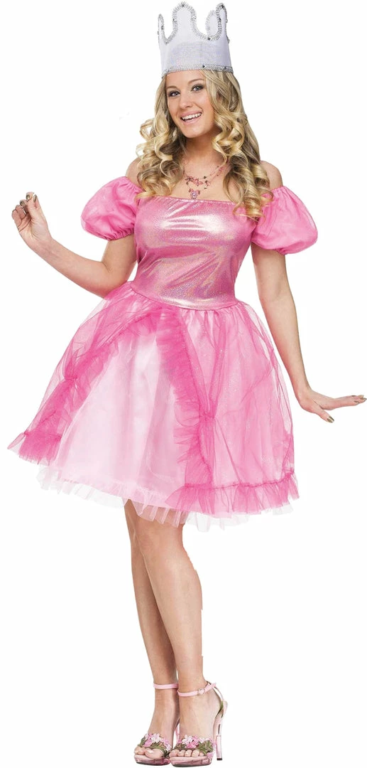 This cute costume is sure to cast a spell wherever you go! Dress with a pink shimmery bodice has a knee-length skirt with sheer layers and a ruffled hem, and includes a sparkly crown with silver trim. Jewelry, shoes, and wand are not included. Fits adult womens sm/med. sizes 2-8.