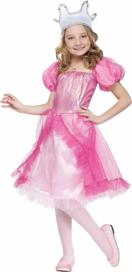 This cute costume is sure to cast a spell wherever you go! Shimmery pink dress and crown. Leggings and shoes are not included.